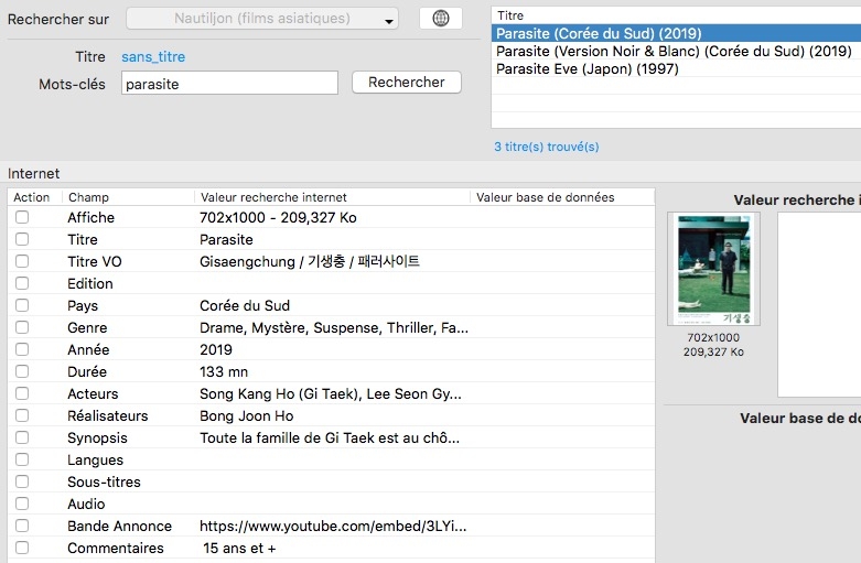 Merci pour avoir pris le temps et l'énergie de réaliser ce script, j'ai cherché longtemps sur Internet un logiciel me permettant d'intégrer des données sur les films et séries asiatique, et là, je suis comblée!