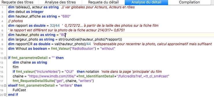 1. En ce qui concerne mon script, je n'utilise que ce que permet ScriptEdit, donc l'écriture de scripts - en particulier ScriptEdit ne permet pas de gérer l'interface Filmotech, et je m'en tiens aux scripts "externes" (donc TMDb est exclu). Le script repose sur Sens Critique : pour les photos 8 acteurs max + les réalisateurs (et dans l'interface Filmotech actuelle).