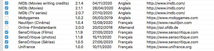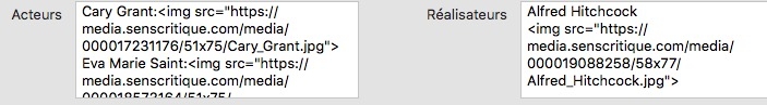 Donc, ce qui est possible c'est de prendre les photos et les acteurs de chaque site (si on coche acteurs, les valeurs actuelles remplaceront les anciennes valeurs, comme pour tout champ). Pour IMDb j'ai vu que les dimensions des photos sont paramétrables; heureusement parce que sur le site, c'est un peu timbre poste. Par contre il n'y a pas les photos des réalisateurs (mais on a celles de Sens Critique).