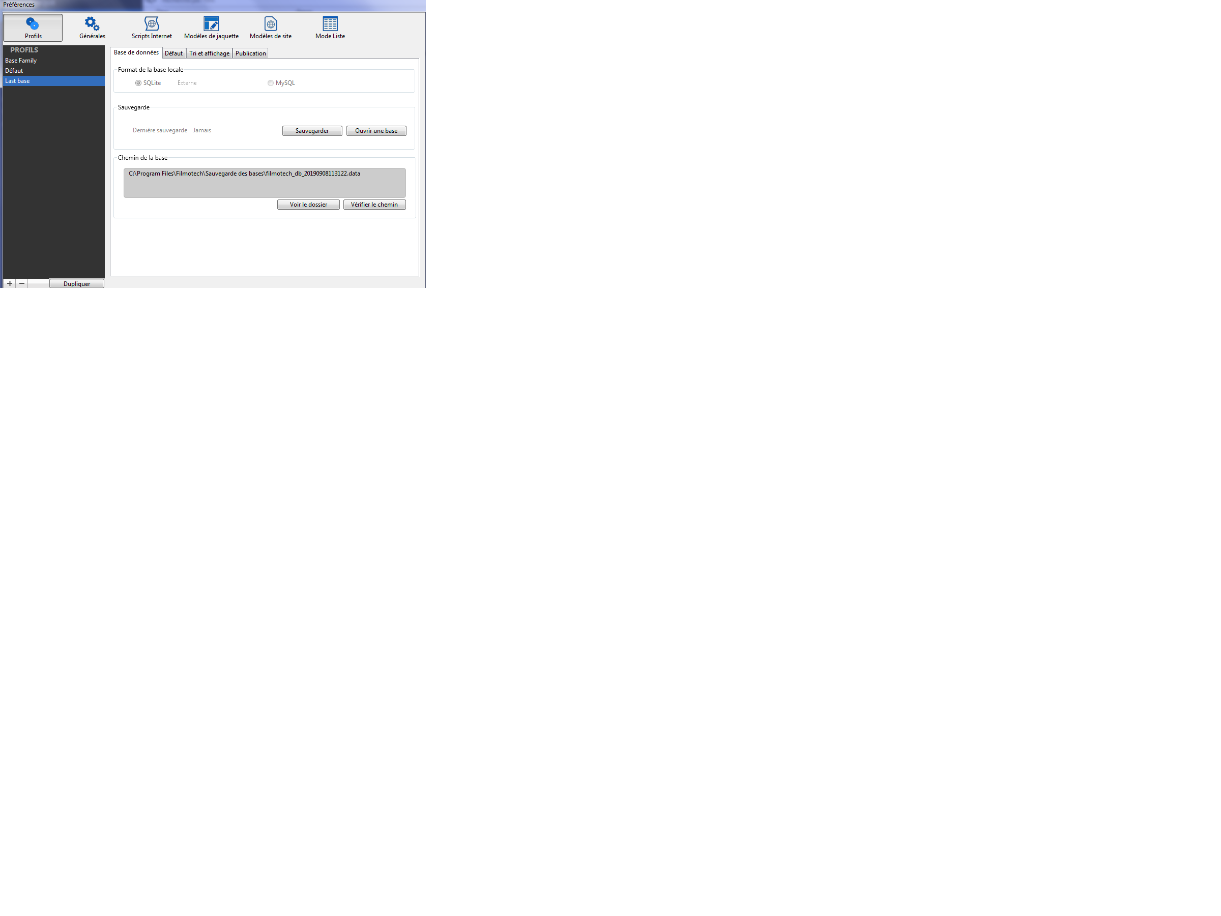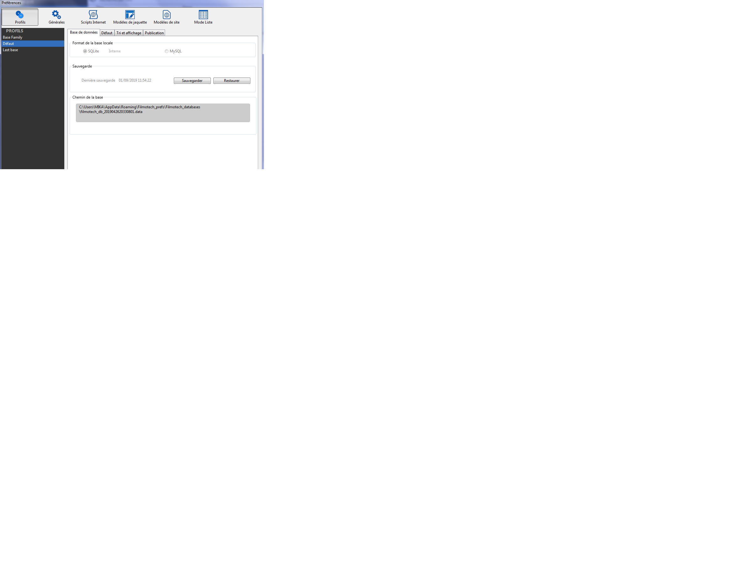 Si je comprends bien pour ta base externe Last base, filmotech_db_date.data, c'est la base qui s'est créée auto dans "sauvegarde des bases" quand tu as créé Last base ?