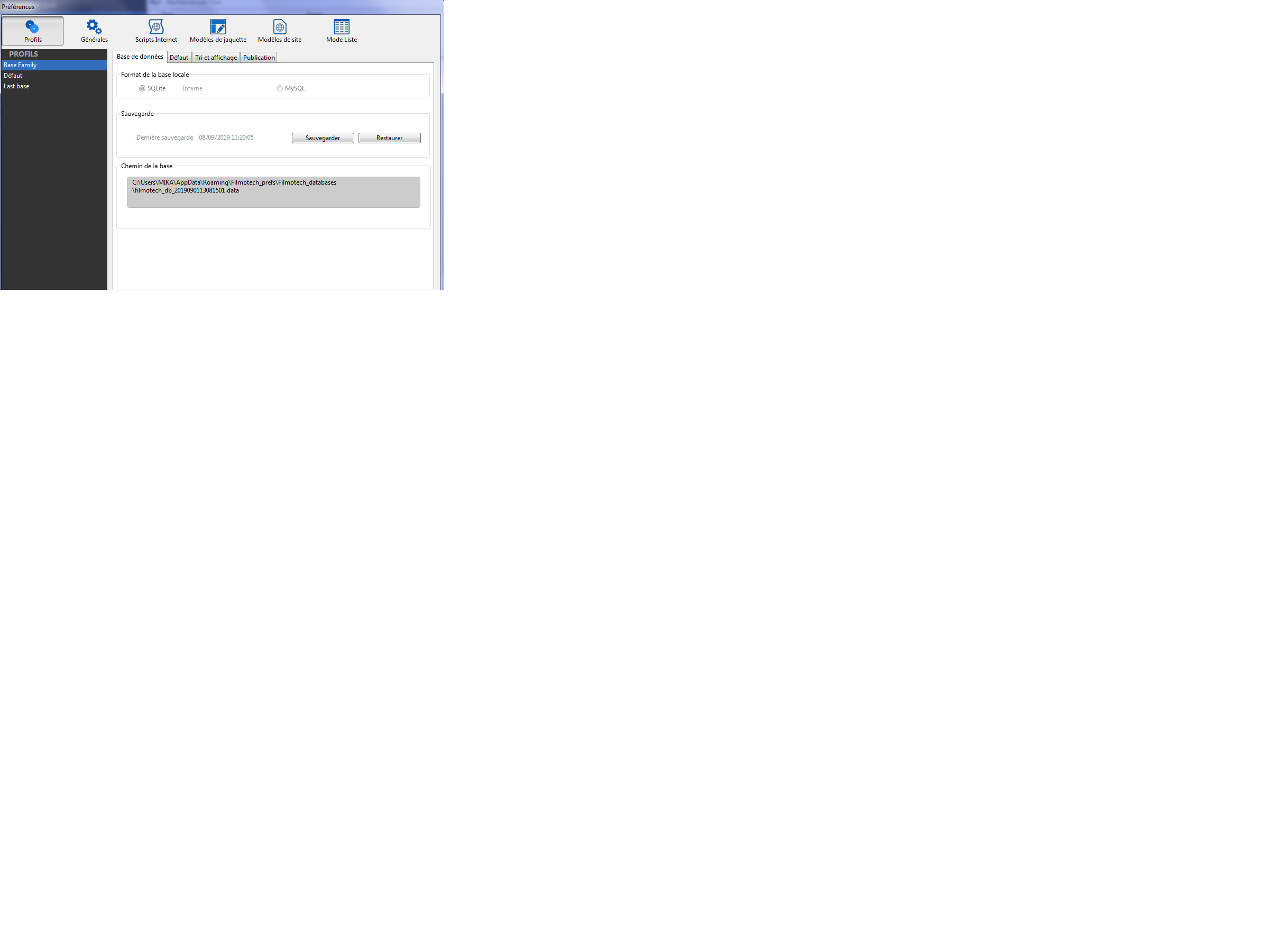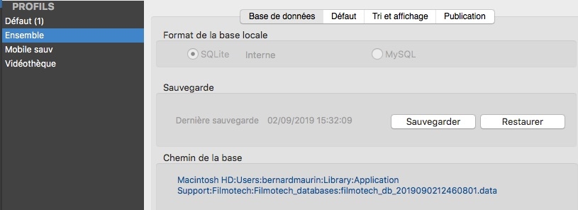 base SQL interne (gestion auto de la base par Filmotech) (mode "normal") (on maitrise l'emplacement, et le nom si on veut, des sauvegardes):