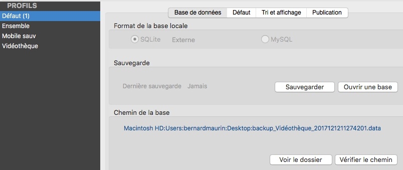 Comme c’est peu pratique pour gérer ses bases, il vaut mieux en avoir des sauvegardes (des copies des bases de travail) : option « sauvegarder » ; là on choisit l’emplacement (et on peut modifier le nom par défaut : backup_Nom_du_Profil_date.data).
