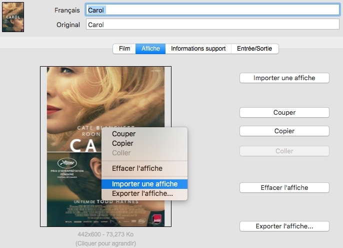 Lorsque vous double-cliquez sur un film dans la liste, vous avez une fenêtre d'édition qui permet de modifier toutes les informations, y compris l'affiche.
