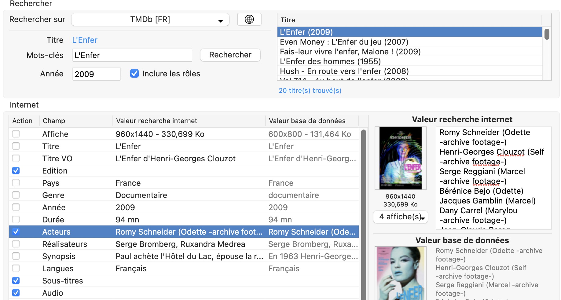 Copie d'écran recherche Filmotech (L'Enfer, année et détails acteurs)