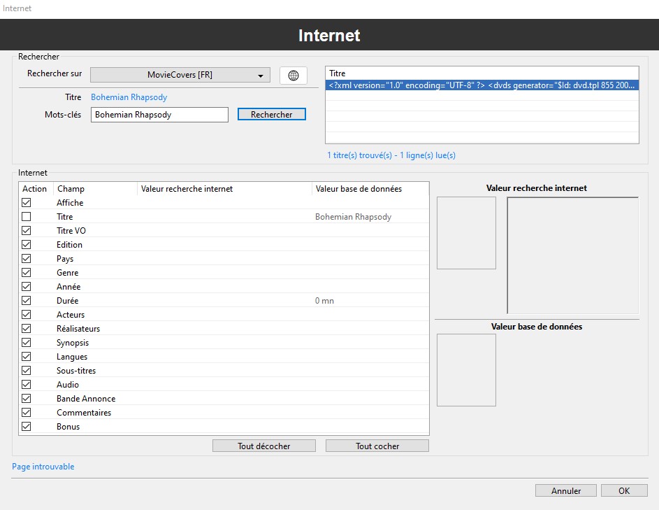 Il y a un problème concernant la recherche avec MovieCovers, qui génère un message d'erreur.
