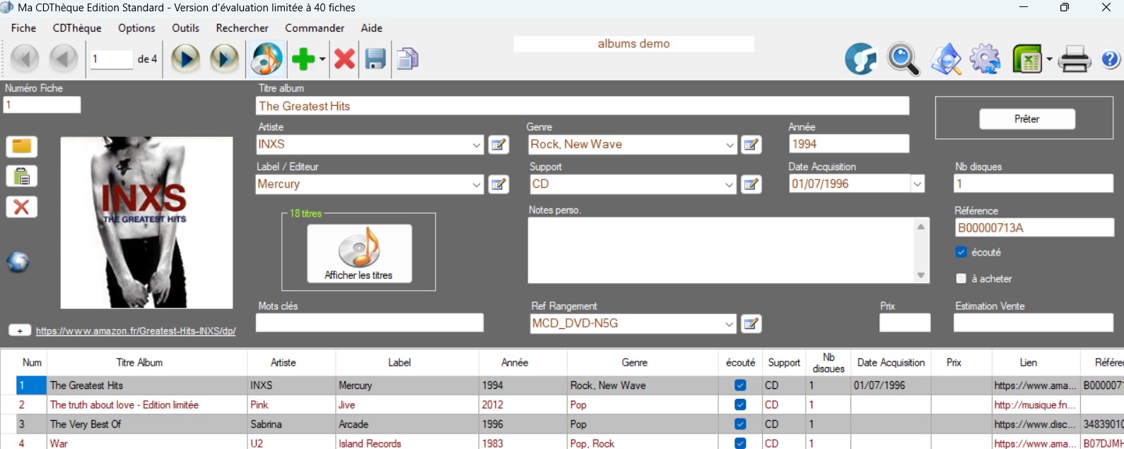 C'est un programme US, mais il est francisé ; l'ergonomie ressemble de celle de Filmotech. L'intérêt, est que le logiciel utilise la base Musique d'Apple (on a toutes les musiques) ; il suffit d'introduire un CD et les infos sont recopiées sur le logiciel. (il y a aussi d'autres bases, mais US...).