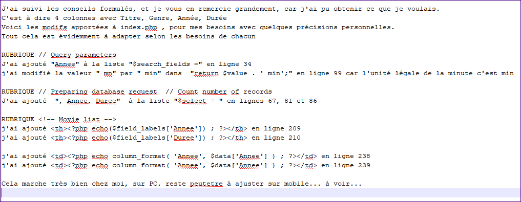 Très bien situ as réussi à mettre à jour. En cas de mise à niveau de Filmotech, tant que tu ne mets pas à jour le site (la page où tu as fait tes modifications) ça ne changera rien. Si un jour il y a une nouvelle version du site, il faudra que tu refasses les modifications ou que tu fasses toi-même une mise à jour de ta page.