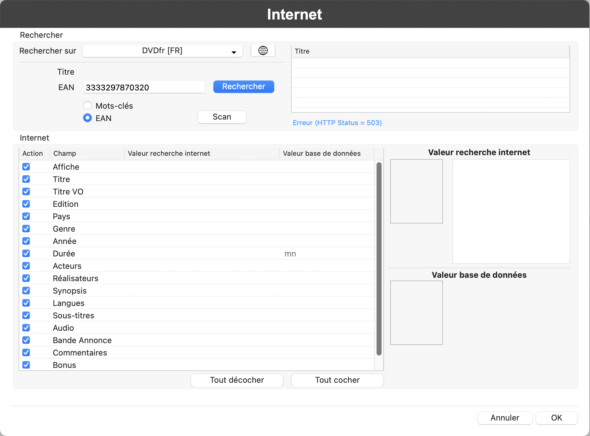 Je me permet de vous contacter car je rencontre un problème récurrent depuis quelques temps. Je vais essayer vous le décrire. Lorsque j'effectue l'ajout d'un DVD ou d'un Blu-ray j'ai une fenêtre qui s'ouvre avec écrit : "Erreur lors de la recherche sur DVDfr :