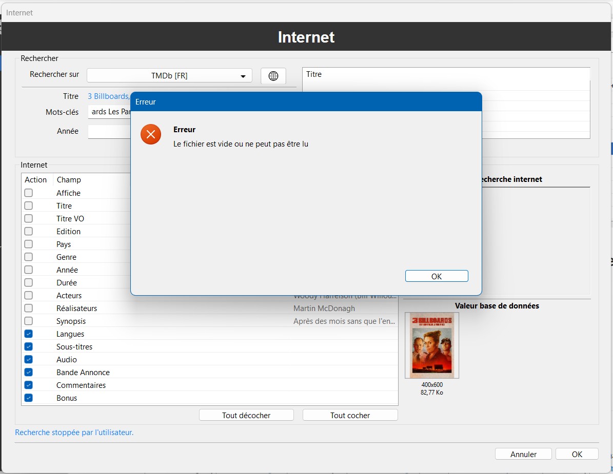 - Lorsque je clique sur "Arrêter, et que je relance la recherche, j'obtiens une fenêtre contenant le message "Erreur : le fichier est vide ou ne peut pas être lu".