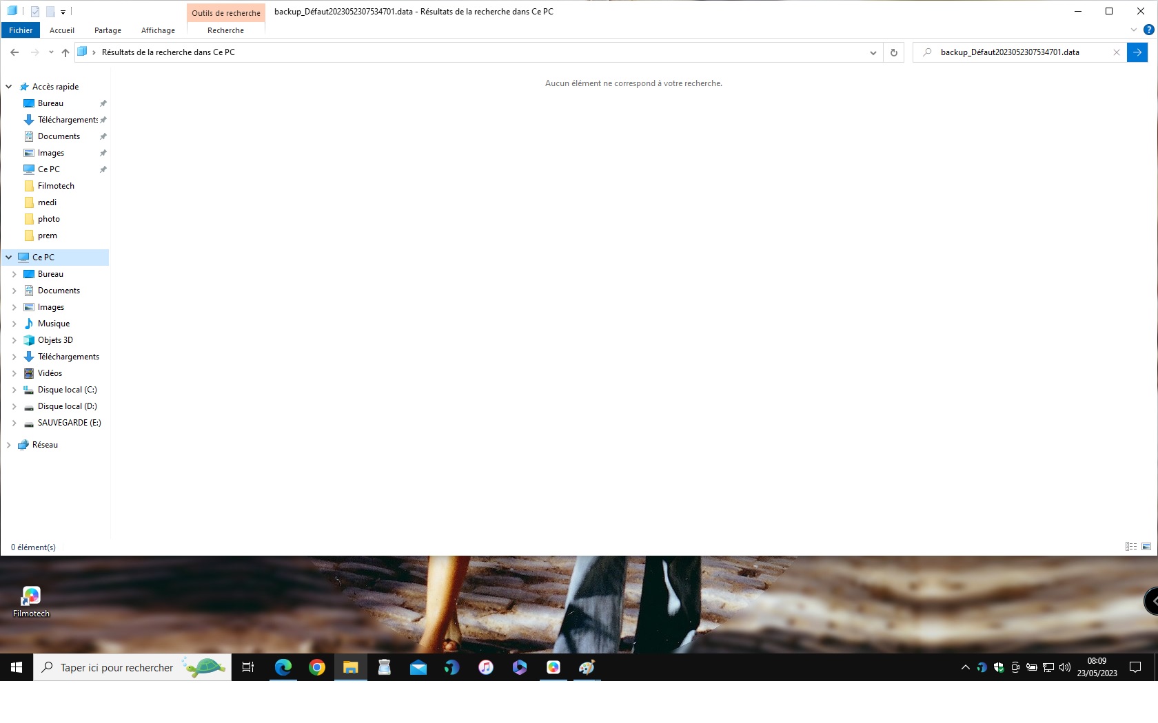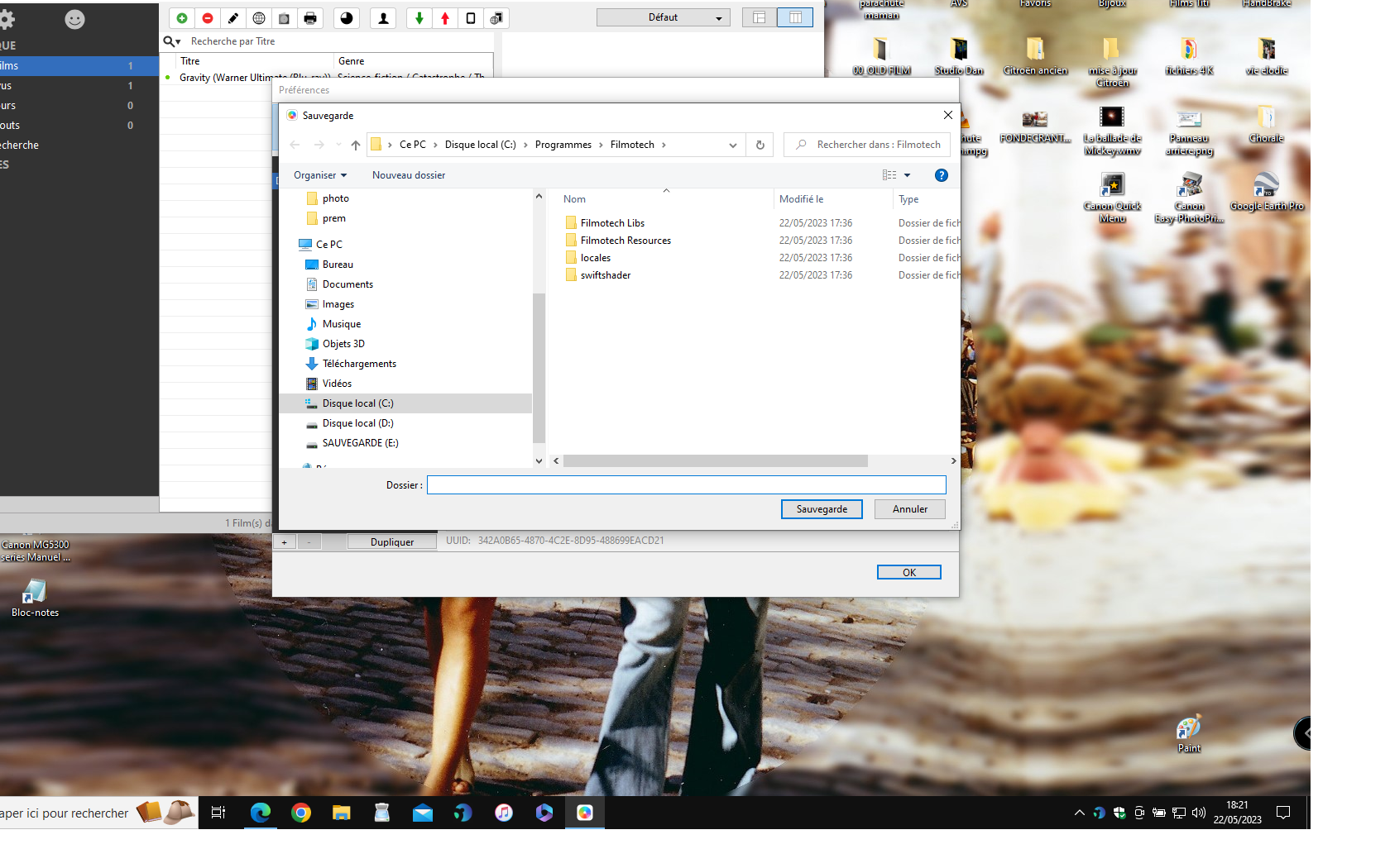 Je pense que le début du problème vient de là, pourtant j'avais fais un dossier Sauvegarde Filmotech, comme tu me l'avais dit, mais ça na pas marché. Donc je fais enregistrer sans choisir le dossier, et la sauvegarde s'est faite Quand je fais ensuite restaurer, un raccourci Filmothech s'est créer dans cet ensemble de dossier et quand je fais restaurer en cliquant sur ce raccourci, il me dit que la base est restaurée, je fais ok et c'est là qu'il me dit qu'il ne trouve pas le chemin de la base.