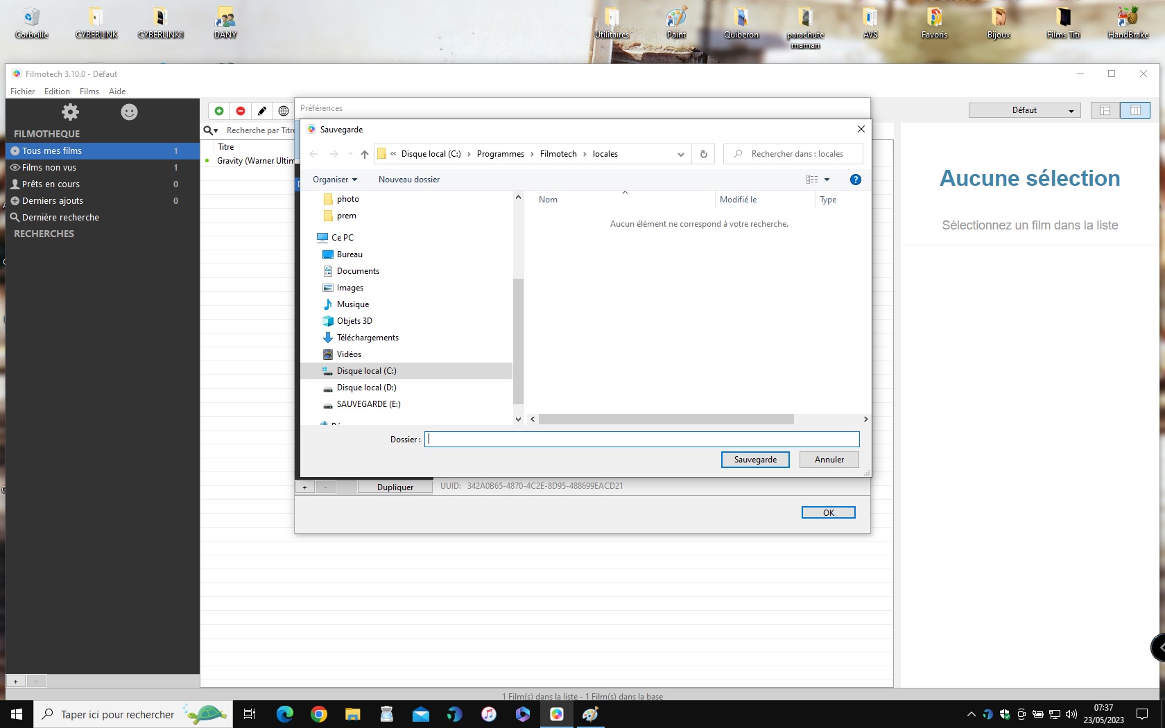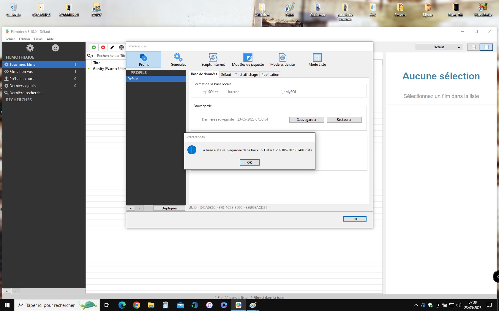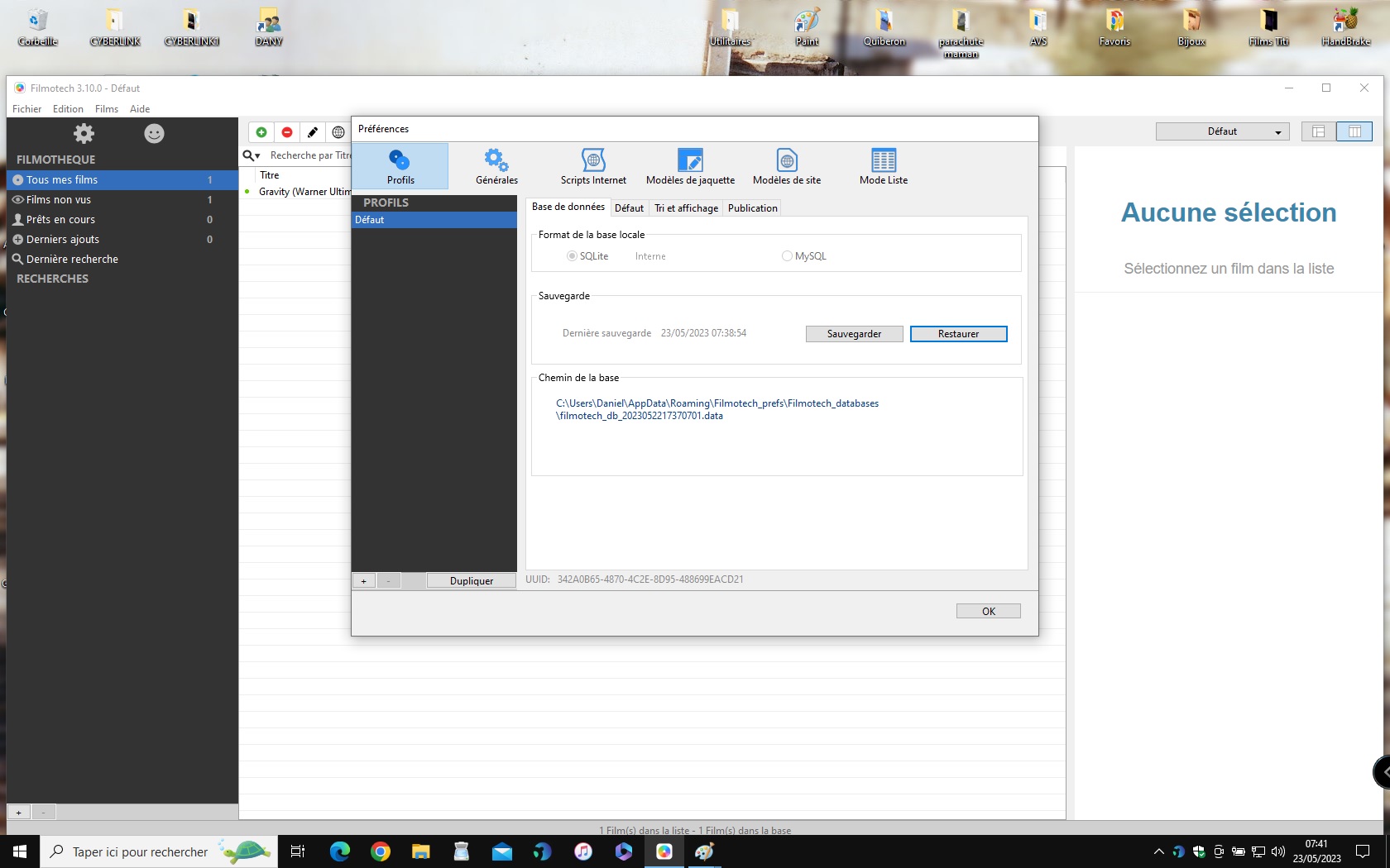 je voudrais savoir comment sauvegarder et restaurer mes films pas à pas, du début à la fin, cliquer sur quelque chose dans préférence, est-ce qu’il faut créer un profil particulier, où est-ce qu’il faut un emplacement spécial. Toutes mes tentatives de sont soldées par des échecs. Quand je veux restaurer, un message me dit qu’il ne trouve pas ma sauvegarde, alors qu’elle se trouve sur le chemin affiché sur l’écran. En plus, après ce message, Filmotech plante et, je ne peux plus ajouter des films, donc je dois désinstaller et réinstaller Filmotech.